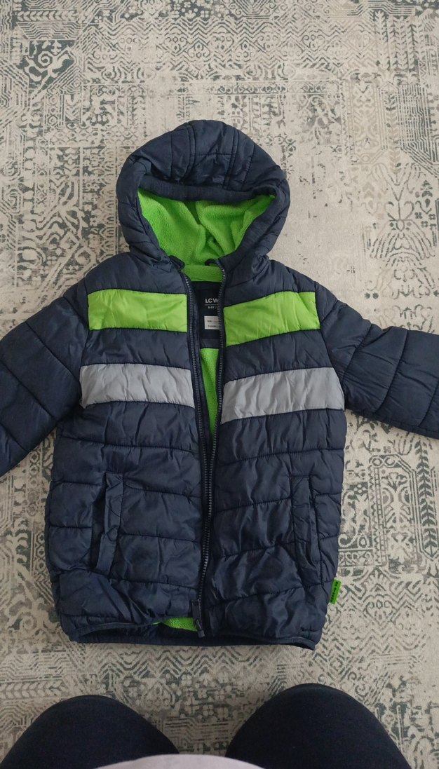 Erkek çocuklar için kapüşonlu, fermuarlı ve fitted kesim mont. Koyu mavi, yeşil ve gri yatay çizgilerle casual tarz sunar. İç kısmı yumuşak ve rahat.