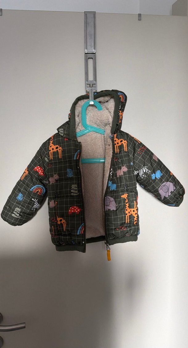 Fermuarlı ve kapüşonlu, yumuşak ve sıcak kumaştan yapılmış dar kesim erkek çocuk montu. Koyu gri renk, renkli hayvan desenleriyle sokak modası stilinde.