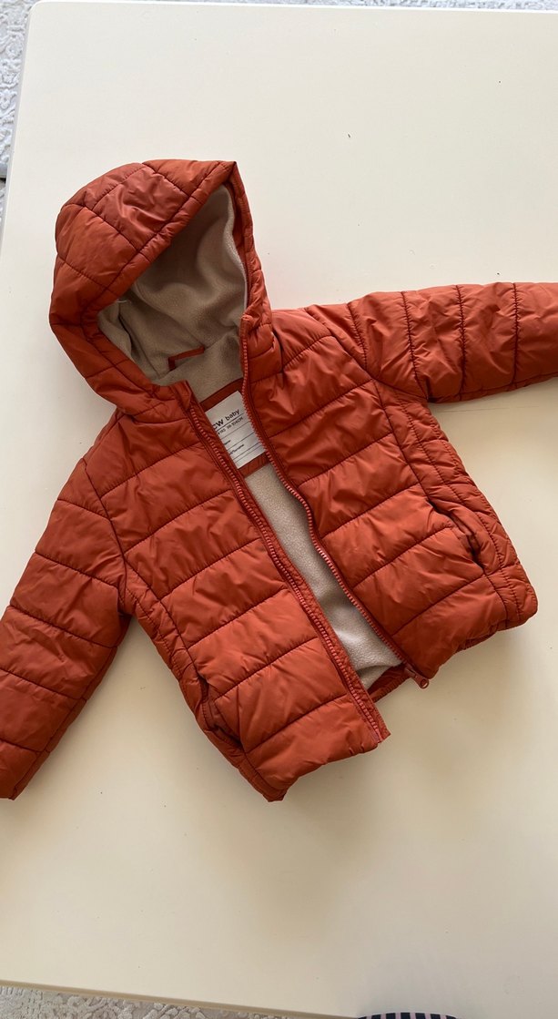 Kapüşonlu ve fermuarlı, turuncu erkek çocuk montu. Yumuşak ve sıcak kumaştan, sade ve basic tarzda tasarlanmıştır. Kapişonunda minik bir deforme var dikilebilir 3-4 yaş