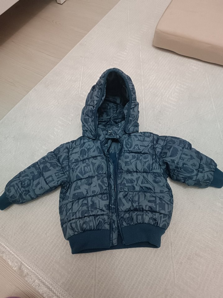 Erkek çocuklar için kapüşonlu ve fermuarlı, gri batik desenli, yumuşak ve sıcak kumaştan üretilmiş, dar kesim sokak tarzı mont.