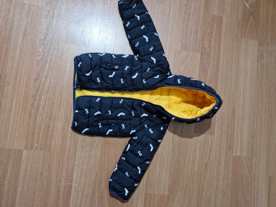 Fermuarlı ve kapüşonlu, dar kesim erkek çocuk montu. İç kısmı koyu sarı, dışı yumuşak ve sıcak kumaşla kaplı, sade desenli sokak stili.