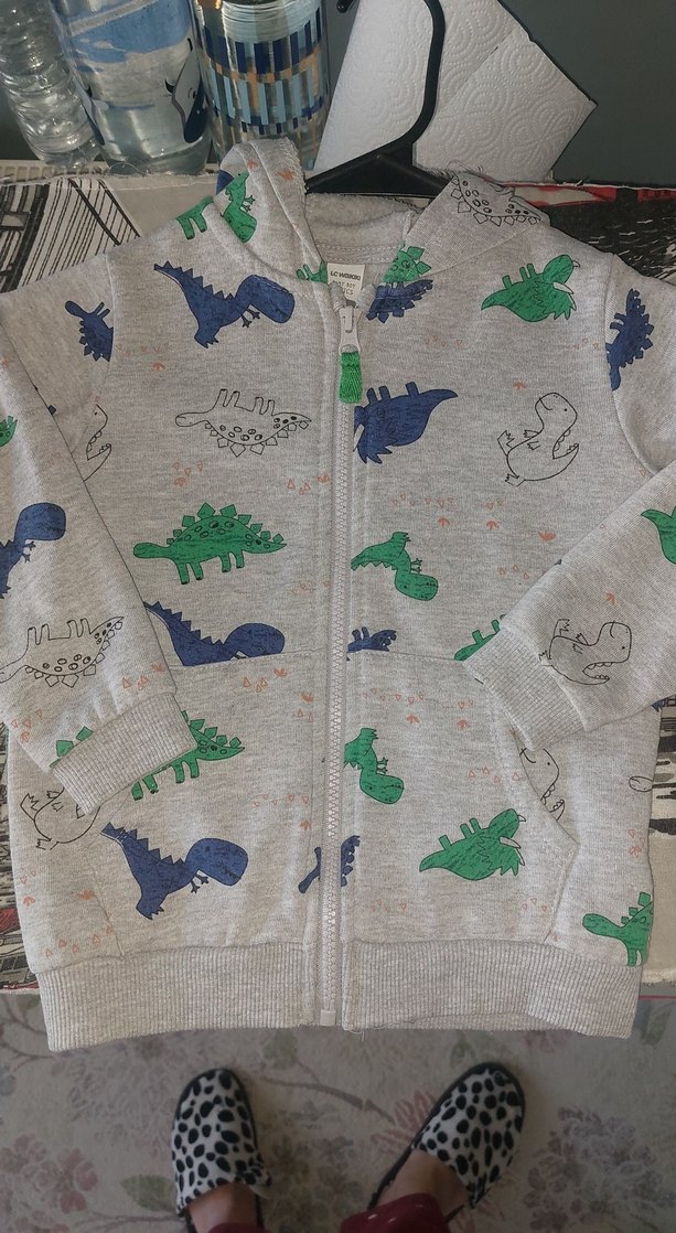 Gri renkli, kapüşonlu ve fermuarlı çocuk sweatshirtü, uzun kollu ve hafif dar kesimdir. Yumuşak ve sıcak kumaştan üretilmiş, renkli dinozor desenleri bulunur.