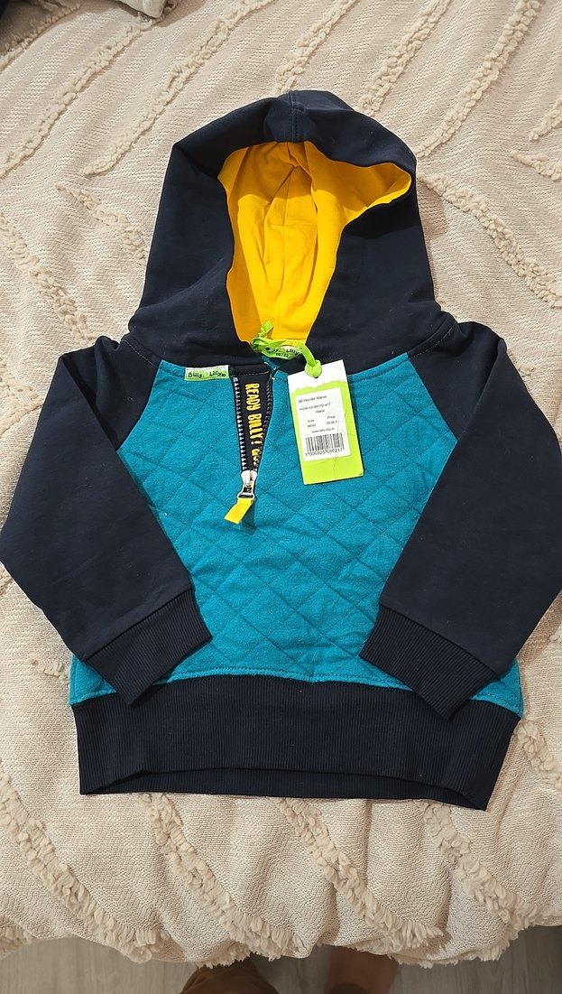 Kapüşonlu ve fermuarlı, dar kesim erkek çocuk sweatshirtü. Sarı ve koyu renklerin baskılı tasarımı, uzun kollu ve yumuşak sıcak kumaştan üretilmiştir. YURTDIŞINDAN ALINDI