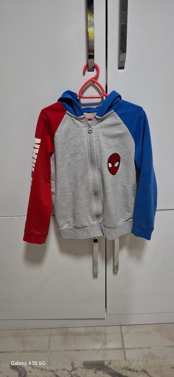 Bu erkek çocuk sweatshirdi kapüşonlu ve fermuarlıdır. Gri gövde, kırmızı ve mavi kollar ve göğüste baskılı Spider-Man yüzü vardır. Yumuşak fleece kumaştandır. ️5-6 yaş için uygundur.