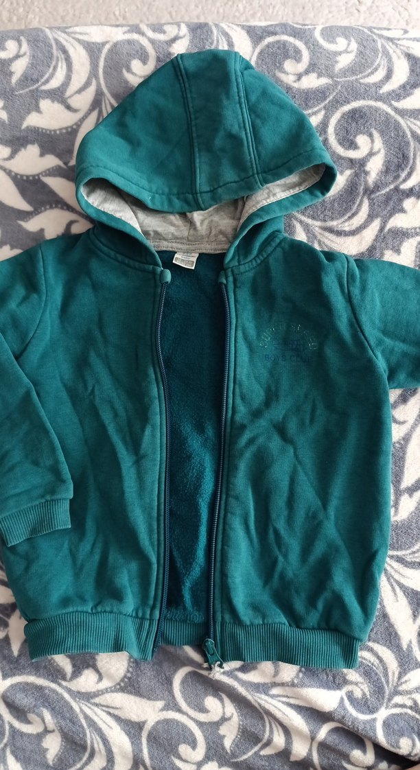 Yeşil kapüşonlu erkek çocuk sweatshirtü, uzun kollu, fermuarlı ve vücuda oturan kesime sahiptir. İç kısmı gri renklidir ve yumuşak, sıcak kumaştan üretilmiştir.