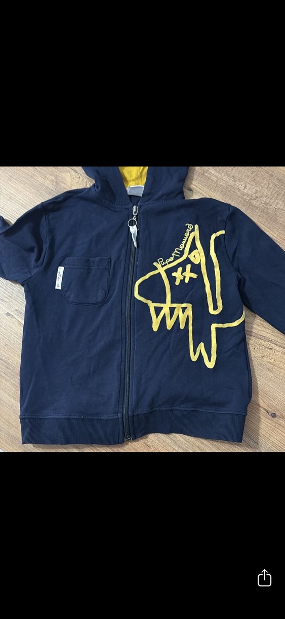 Erkek çocuklar için kapüşonlu, fermuarlı ve uzun kollu bu sweatshirt, yumuşak ve sıcak kumaştan yapılmıştır. Koyu mavi renkte ve sarı baskılı desenlidir.