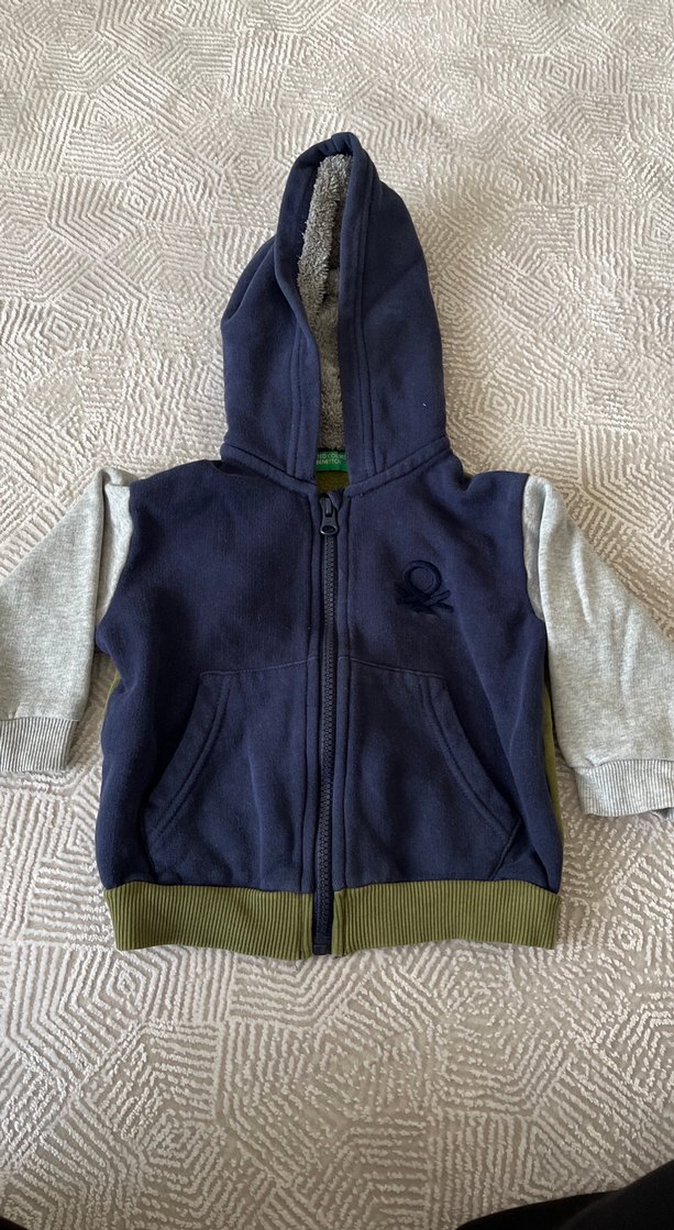 Kapüşonlu ve uzun kollu, yumuşak ve sıcak kumaştan yapılmış erkek çocuk sweatshirtü. Ön fermuarlı ve gri-lacivert tonlarında, rahat sokak stili için uygun.