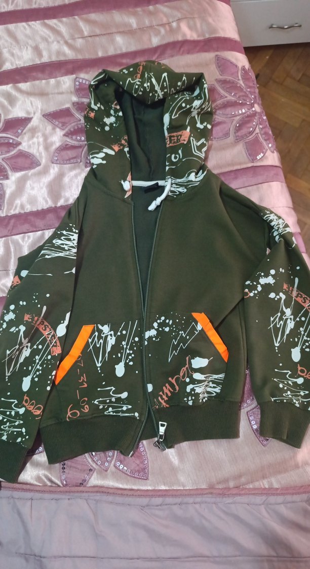 Kapüşonlu ve fermuarlı erkek çocuk sweatshirt, yumuşak ve sıcak kumaştan üretilmiştir. Uzun kollu, bol kesim, koyu kahverengi renk ve baskılı sokak stili tasarıma sahiptir. Ceplerde turuncu detaylar vardır.