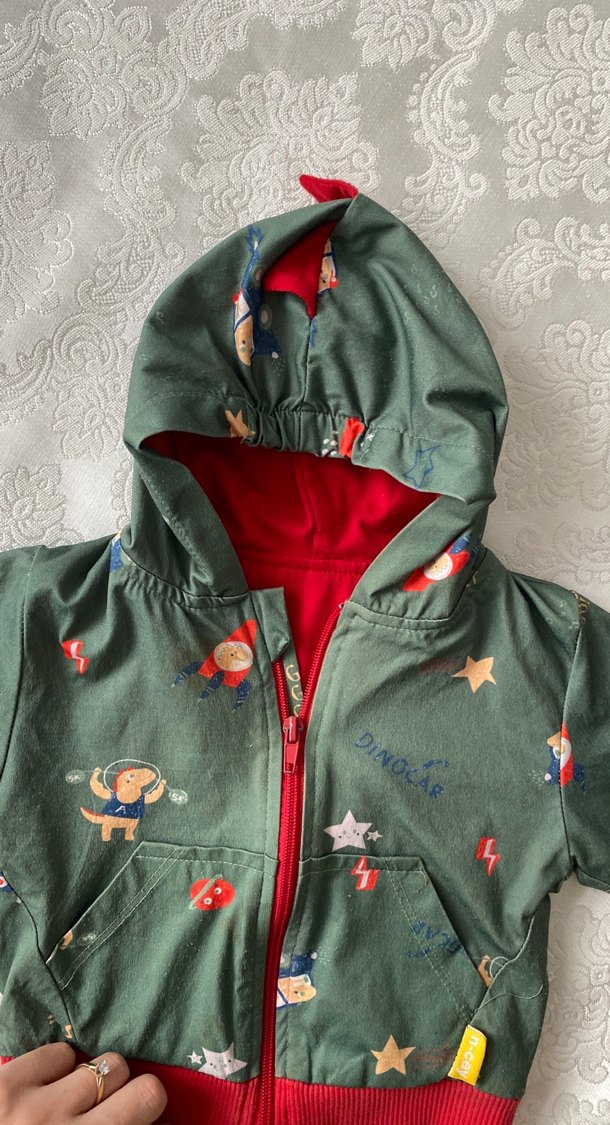 Kapüşonlu ve fermuarlı, yumuşak polar kumaştan yapılmış, renkli baskılı yeşil erkek çocuk yağmurluğu. Sokak stiline uygun, dar kesim.
