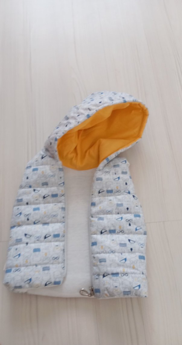 Erkek çocuklar için kapüşonlu ve fermuarlı, baskılı desenli, gri-beyaz renklerde, regular fit yelek. Kapüşonun içi sarı kumaşla kaplanmıştır. 5 aya kadar rahat olur