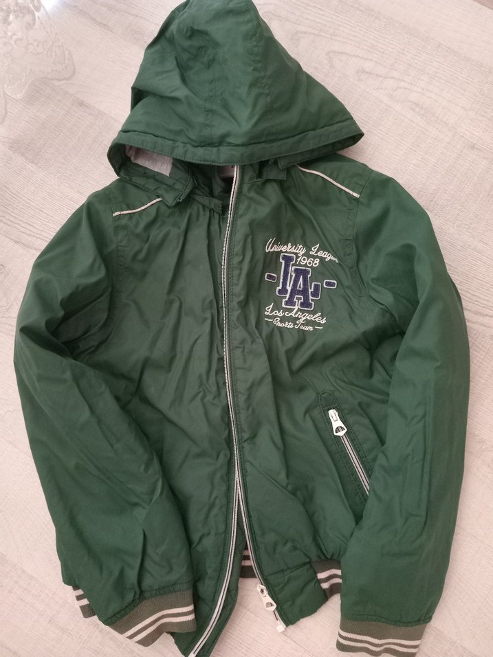 Yeşil, parlak renkte kapüşonlu ve fermuarlı erkek çocuk ceketi. Baskılı detayları ve yumuşak, sıcak tutan iç yüzeyi vardır.