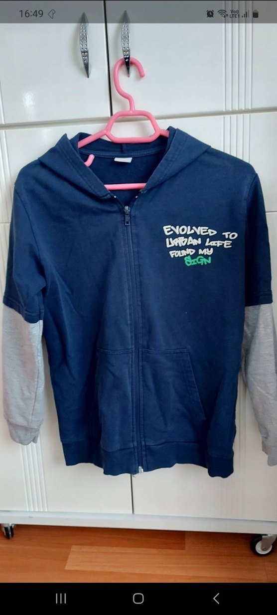 Uzun kollu, kapüşonlu ve fermuarlı bu erkek sweatshirtü, baskılı yazı ve gri kollarla koyu mavi renktedir. Yumuşak ve sıcak kumaştandır.