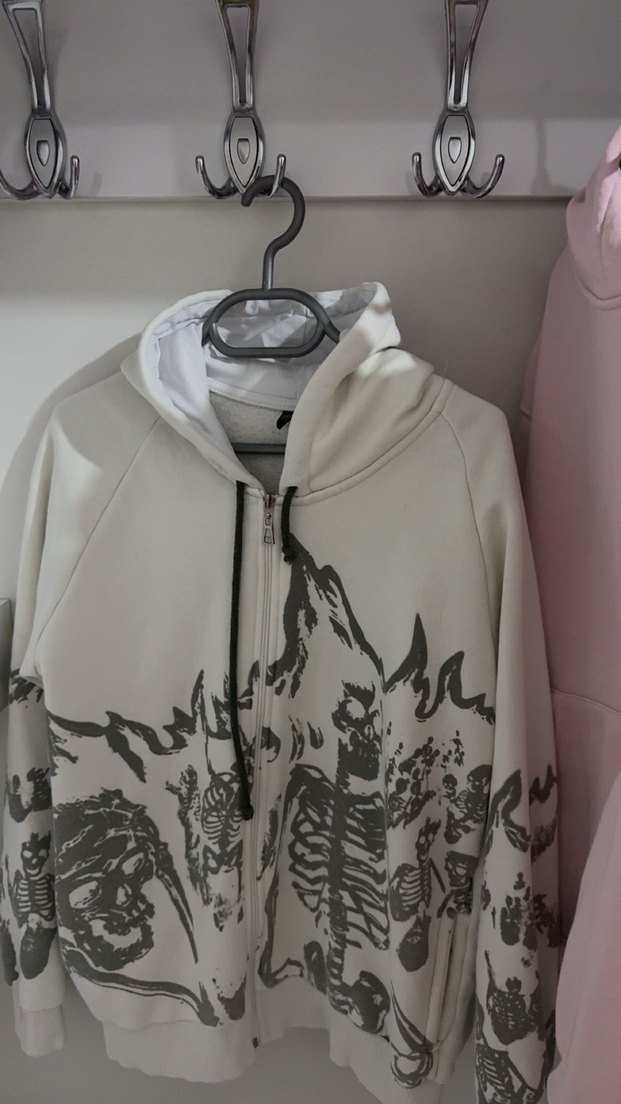 Kapüşonlu ve fermuarlı, gevşek kesim gri sweatshirt, iskelet desenli baskıya sahiptir. Yumuşak sentetik kumaştan yapılmıştır, sokak stiline uygundur.