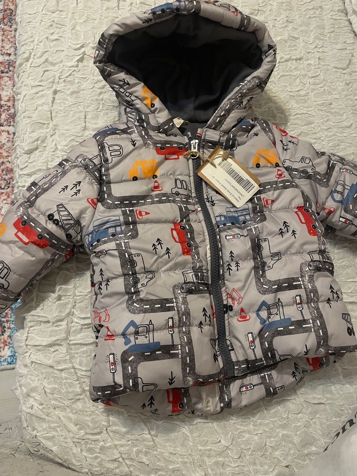 Fermuarlı ve kapüşonlu, baskılı gri erkek çocuk montu. Rahat ve sıcak tutan yumuşak kumaştan üretilmiştir. 1 yaş içindir. Etiketlidir.