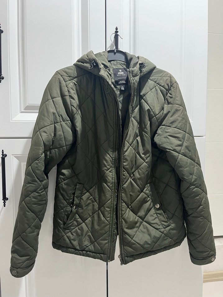 Kadın montu fermuarlı ve kapüşonlu, yumuşak ve sıcak kumaştan yapılmıştır. Dar kesim, uzun kollu ve normal boydadır. Gri renkte, günlük kullanıma uygundur.