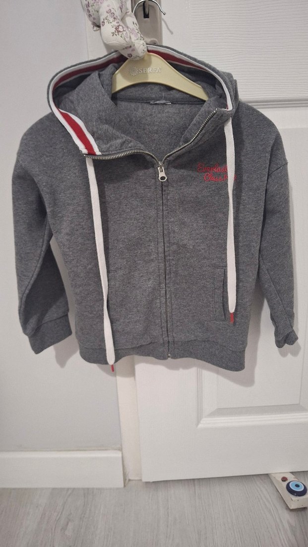 Yumuşak kumaştan yapılmış, kapüşonlu ve fermuarlı gri erkek çocuk sweatshirtü. Uzun kollu ve nakış detaylı, rahat sokak stili için uygun.