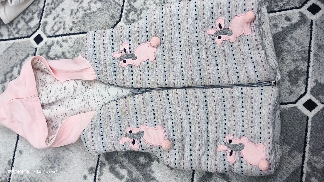 Fermuarlı ve kapüşonlu gri bebek tulumu, nakışlı desenlerle süslenmiştir. ❄️