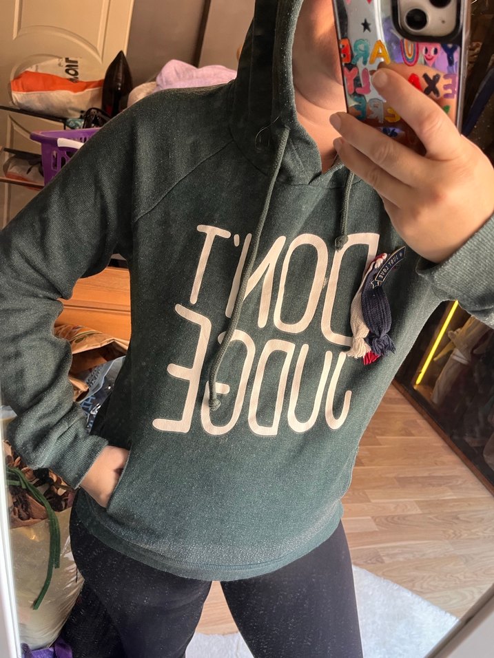 Gri-yeşil tonlarında, yüksek yakalı ve fermuarlı, baskılı ön yüzlü bol kesim sweatshirt. Uzun kollu ve günlük kullanıma uygun.