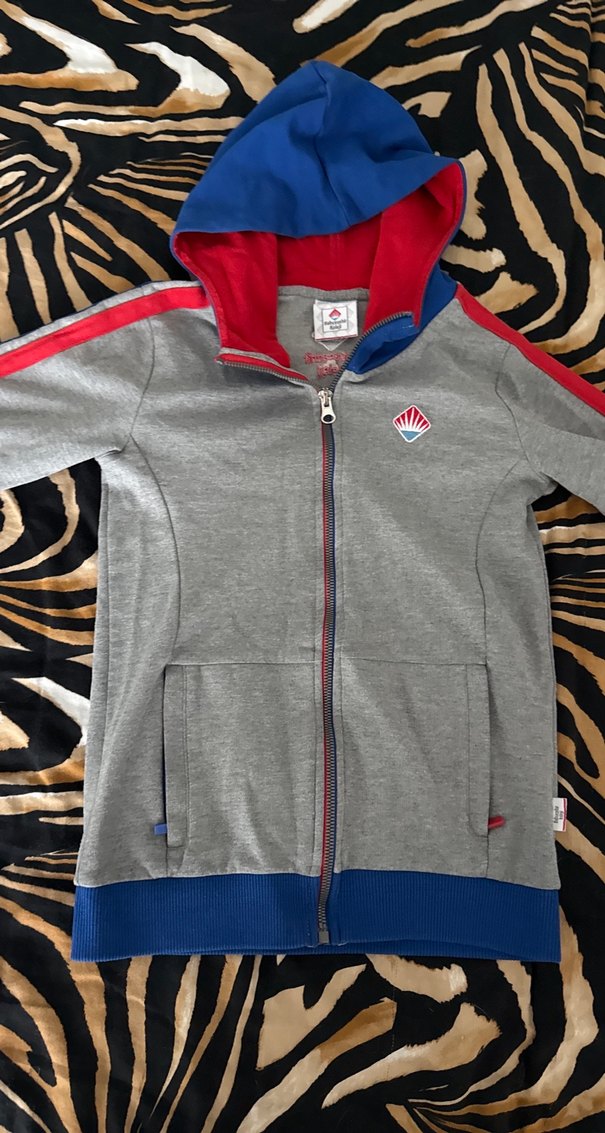 Yumuşak kumaştan, kapüşonlu ve fermuarlı, uzun kollu, gri ve mavi-kırmızı detaylı, fitted erkek sweatshirt.