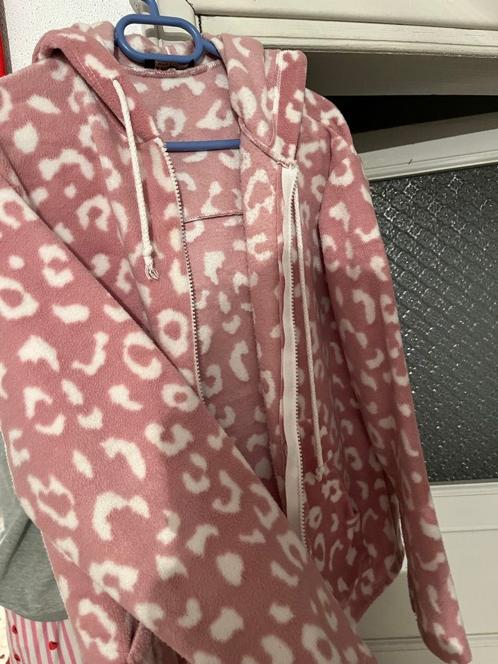 Kapüşonlu, fermuarlı, uzun kollu kadın ceket. Rahat kesim ve midi boyda, yumuşak ve sıcak kumaştan, pembe desenli. Günlük sokak stili için uygun.