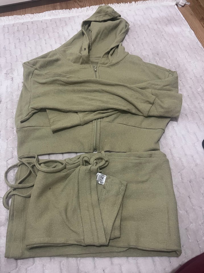 Kadınlar için kapüşonlu, fermuarlı ve vücuda oturan kesime sahip, yumuşak ve sıcak kumaştan yapılmış haki renkli eşofman takımıdır. Uzun kollu ve midi boydadır, günlük rahat sokak stili için uygundur. ♀️