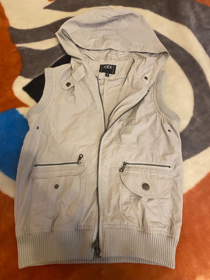 Kapüşonlu, fermuarlı, pamuklu, bej renkli, kolsuz ve vücuda oturan kadın yeleği. Günlük sokak stili için uygun. Deformesi yok