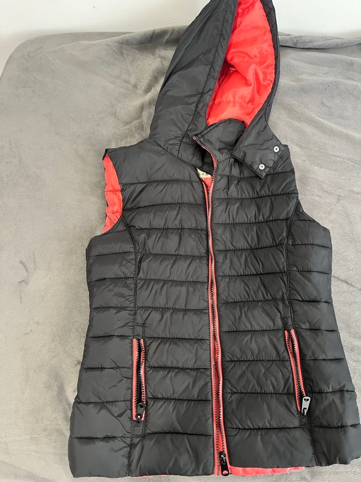 Kapüşonlu ve fermuarlı cepleri olan, kırmızı astarlı siyah şişme kolsuz yelek. Trendy casual tarz için dar kesim, dış mekan kullanımı için uygun.