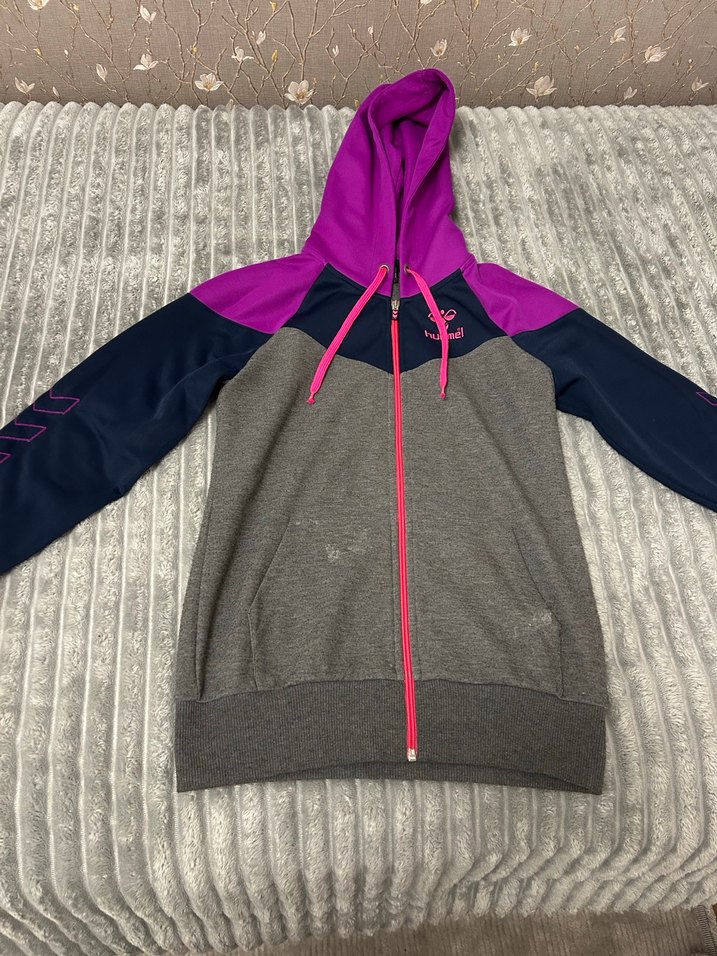 Uzun kollu, fermuarlı ve kapüşonlu kadın hırka Yumuşak ve sıcak kumaştan, gri, ve mor renk bloklu baskılı tasarıma sahip, sportif günlük kullanım için uygun. sadece 2. görselde çektim üzerinde lekeler var
