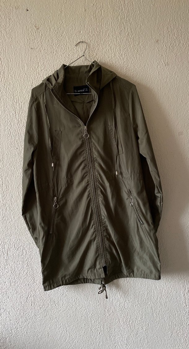 Haki yeşili(asker yeşili) 40 beden kapüşonlu kadın yağmurluk. Az kullanılmış, herhangi bir leke ya da yıpranma yoktur. Bel kısmındaki ipi eksik ama dış görünüşünü etkilemiyor. Hem spor hem günlük kombinlere çok uygun, hafif ve rahat bir modeldir %100 polyester kumaştır.