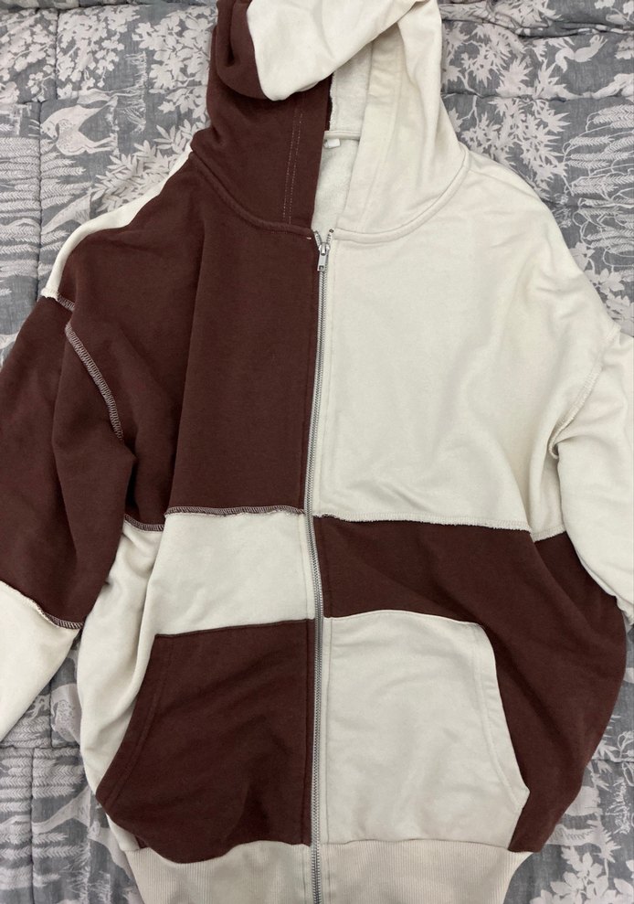 Kadın sweatshirt, fermuarlı ön, kapüşonlu ve uzun kollu. Bol kesim, kahverengi ve krem renk bloklu, yumuşak ve sıcak kumaştan. Sokak tarzı ve günlük kullanım için uygundur.