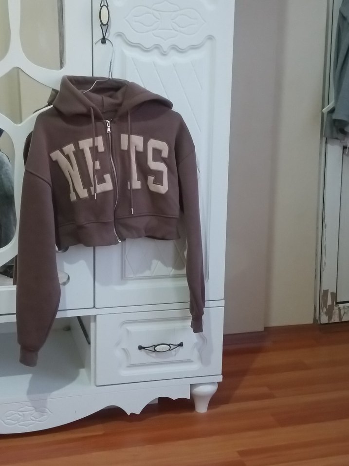 Fermuarlı ve kapüşonlu kahverengi, fitted kesim kadın sweatshirtü. Uzun kollu, "LETS" baskılı, yumuşak ve rahat kumaşlı. Sokak stili için uygun.