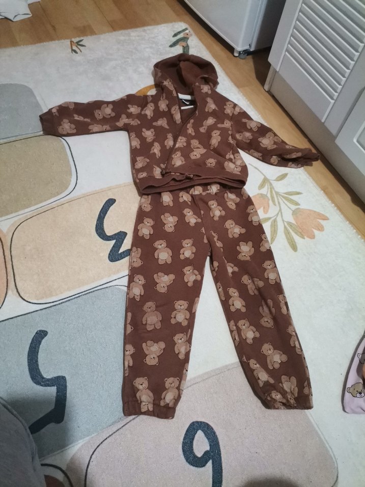 Kapüşonlu, uzun kollu, düğmeli ve kahverengi pijama takımı, ayı desenlidir. Temiz