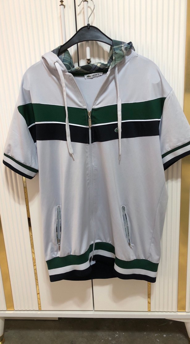 Beyaz renkte, kısa kollu, kapüşonlu ve fermuarlı erkek sweatshirtü. Yeşil ve siyah baskılı çizgilerle rahat kesim sunar.