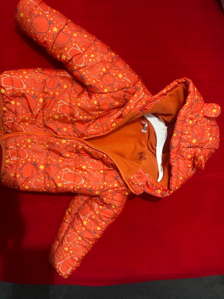 Canlı turuncu renkli, kapüşonlu ve fermuarlı kız/erkek bebek kış mont. Desenli ve sıcak tutan yapıda. ❄️