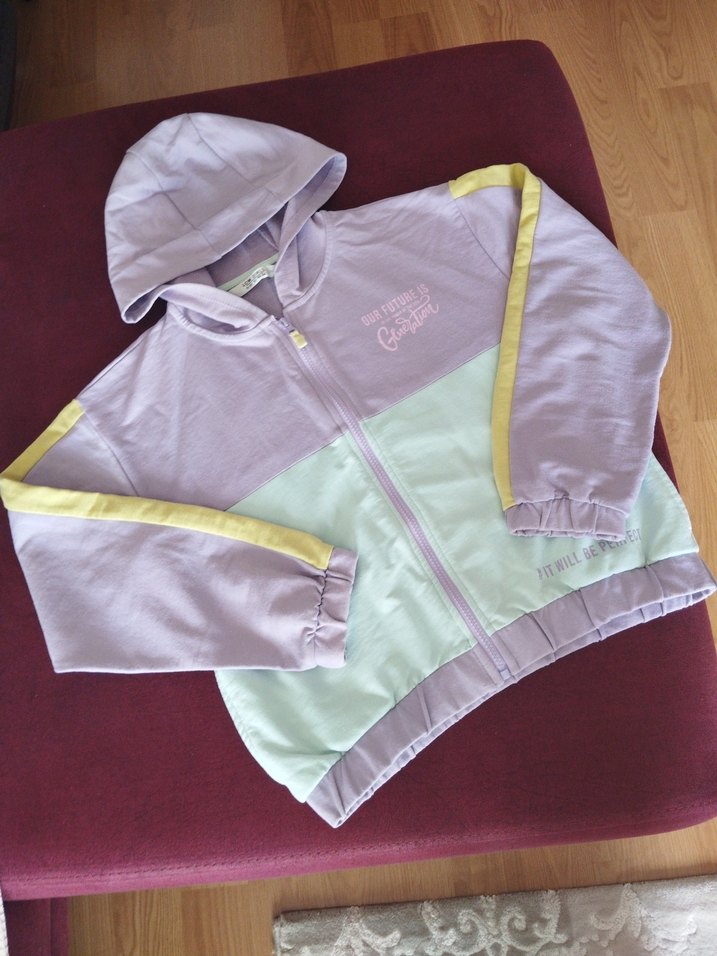 Pastel mor ve mint yeşili renklerde kapüşonlu, fermuarlı kız sweatshirtü. Bol kesim, uzun kollu ve baskılı detaylara sahip.