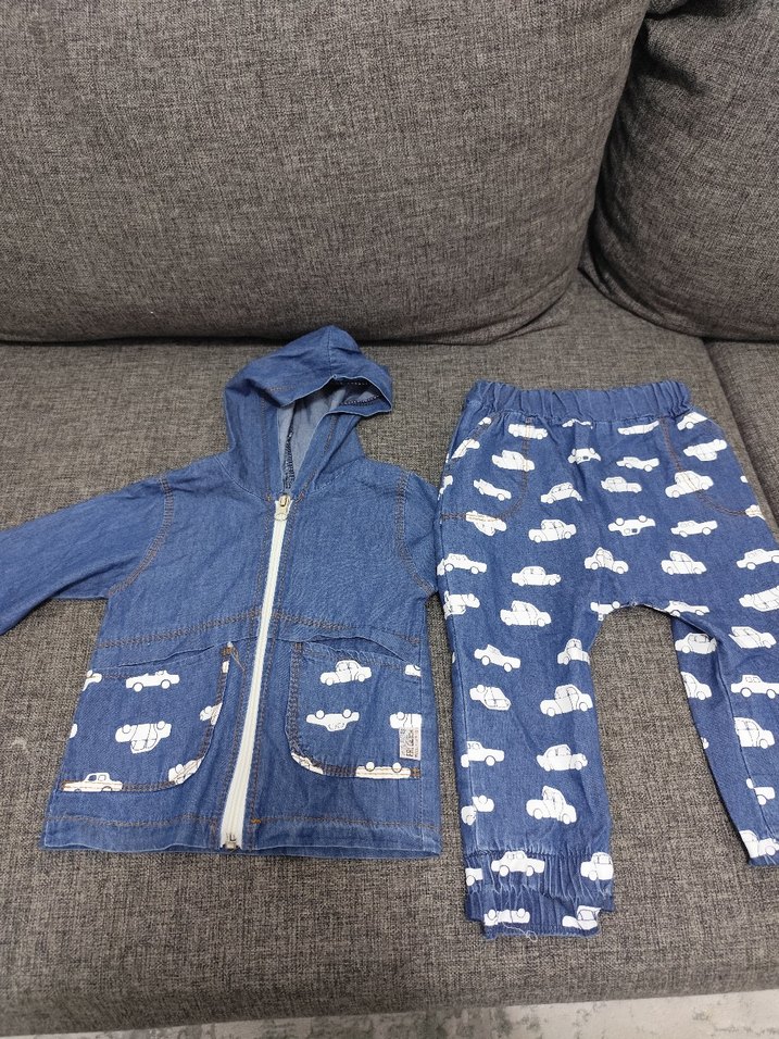 Mavi kot kumaştan, kapüşonlu ve fermuarlı ceket ile beyaz araba desenli pantolondan oluşan bebek takımı. Rahat ve şık sokak stili.