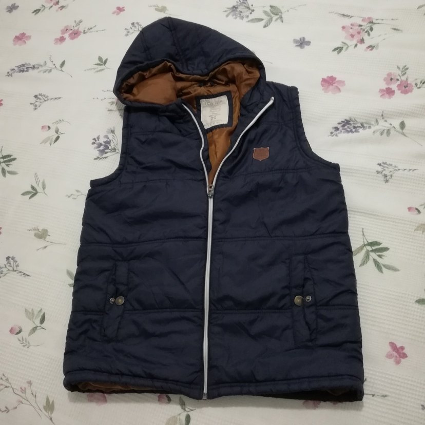 Fermuarlı, kapüşonlu, lacivert, yumuşak ve sıcak kumaştan yapılmış, normal boy ve düğmeli cepli, fitted kesim erkek yelek.
