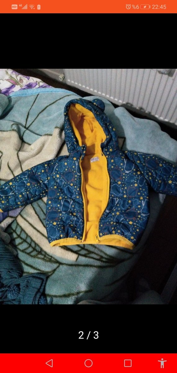 Kapüşonlu ve fermuarlı, yumuşak fleece kumaştan yapılmış renkli mavi tie-dye desenli, fit kesim erkek çocuk montu. İç kısmı parlak sarı renkte.