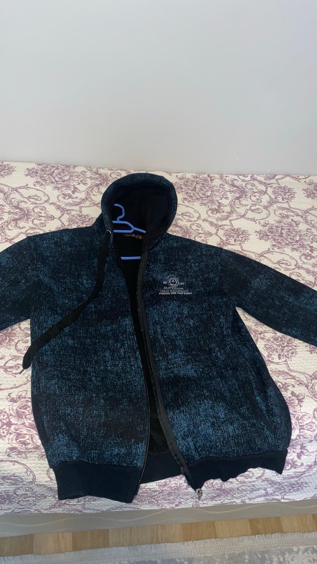 kapüşonlu ve fermuarlı, koyu mavi baskılı desene sahiptir. Uzun kollu ve normal midi uzunluğunda, rahat sokak stili için uygundur. Yumuşak ve konforlu kumaşı günlük kullanıma uygundur.