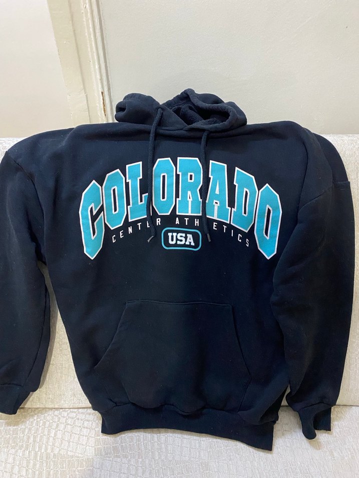 Uzun kollu, kapüşonlu ve fermuarlı mavi sweatshirt. Yumuşak ve sıcak kumaştan, bol kesim ve normal uzunlukta, üzerinde Colorado USA baskısı bulunur.