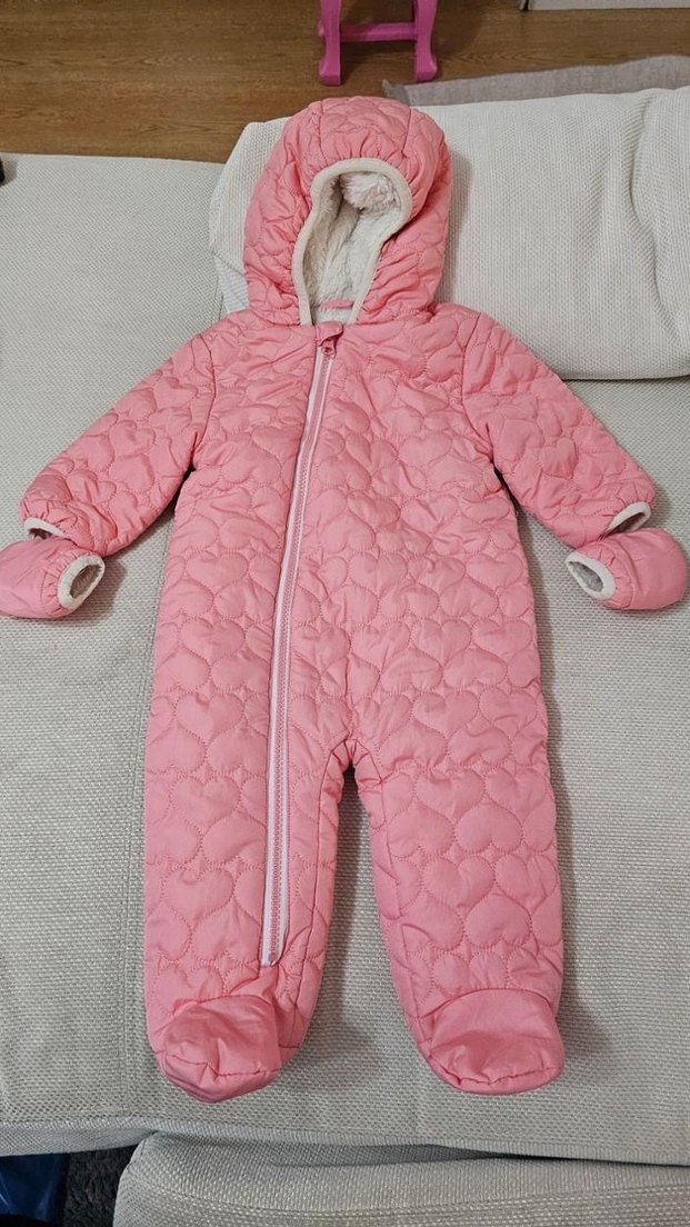 Pastel pembe renkte, kapüşonlu ve fermuarlı bebek tulumu. Kapitone dikişli ve eldivenleri bağlıdır, soğuk havalar için uygundur. ❄️ Hiçbir defosu yok kızıma küçük geldiği için satıyorum 6-9 ay 74 cm patikli astronot tulum