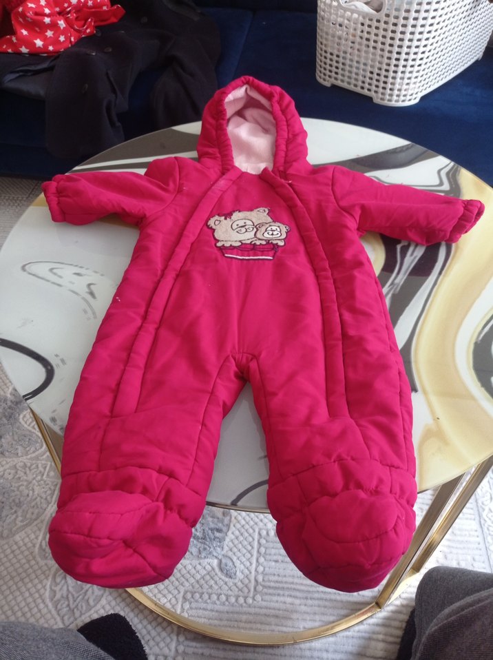 Kapüşonlu ve fermuarlı, renkli baskılı pembe bebek tulumu. Tam koruma sağlar ve sıcak tutar. ❄️