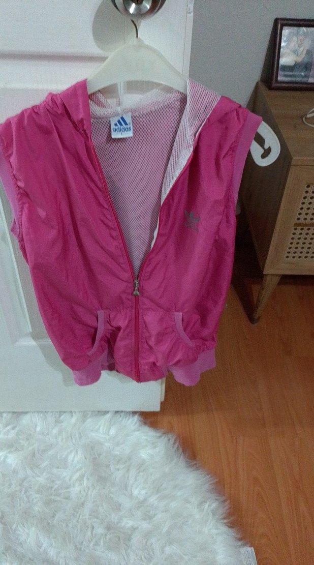 Parlak pembe renkte, kapüşonlu ve fermuarlı kız çocuk yeleği. Sentetik kumaştan üretilmiş, kolsuz ve dar kesim, sokak modasına uygun tarzda.