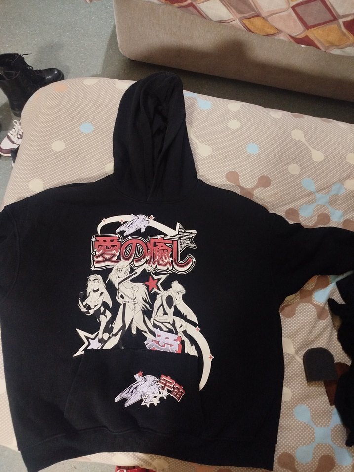 Yumuşak ve sıcak kumaştan yapılmış, baskılı desenli, kapüşonlu siyah sweatshirt. Rahat kesimiyle günlük kullanıma uygundur. s-m bedenlerine uygundur