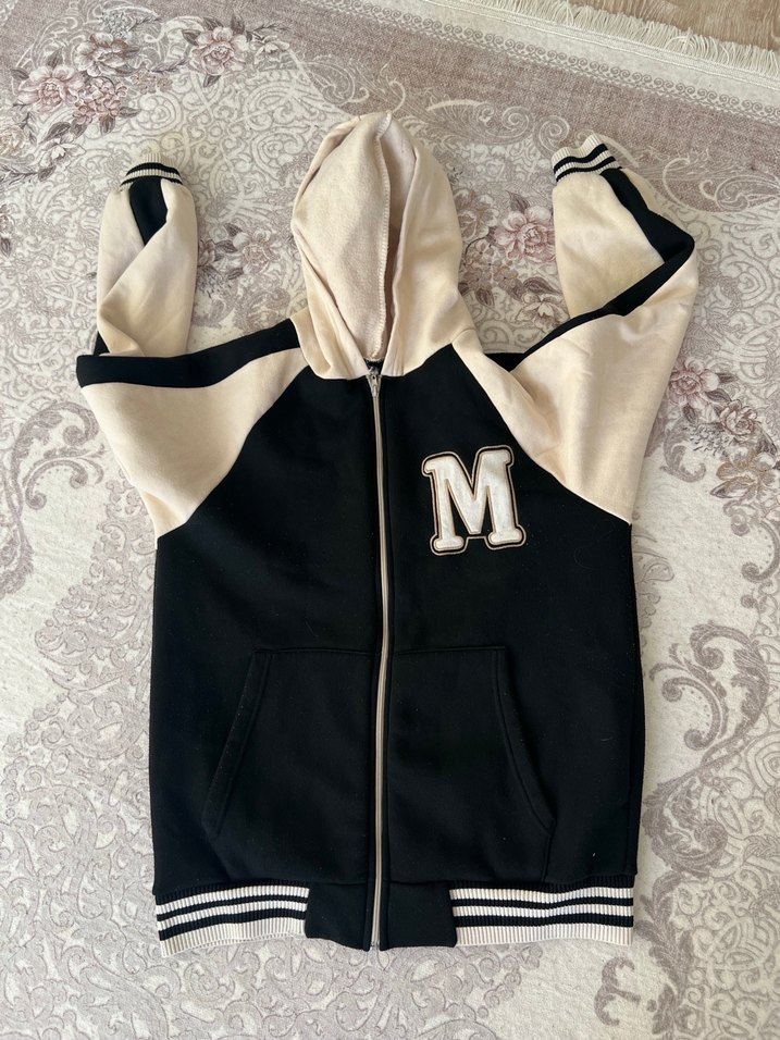 Fermuarlı ve kapüşonlu, yumuşak ve sıcak kumaştan yapılmış, uzun kollu ve göğsünde büyük 'M' baskılı siyah-beyaz kadın ceketi. Sokak stili için uygun.