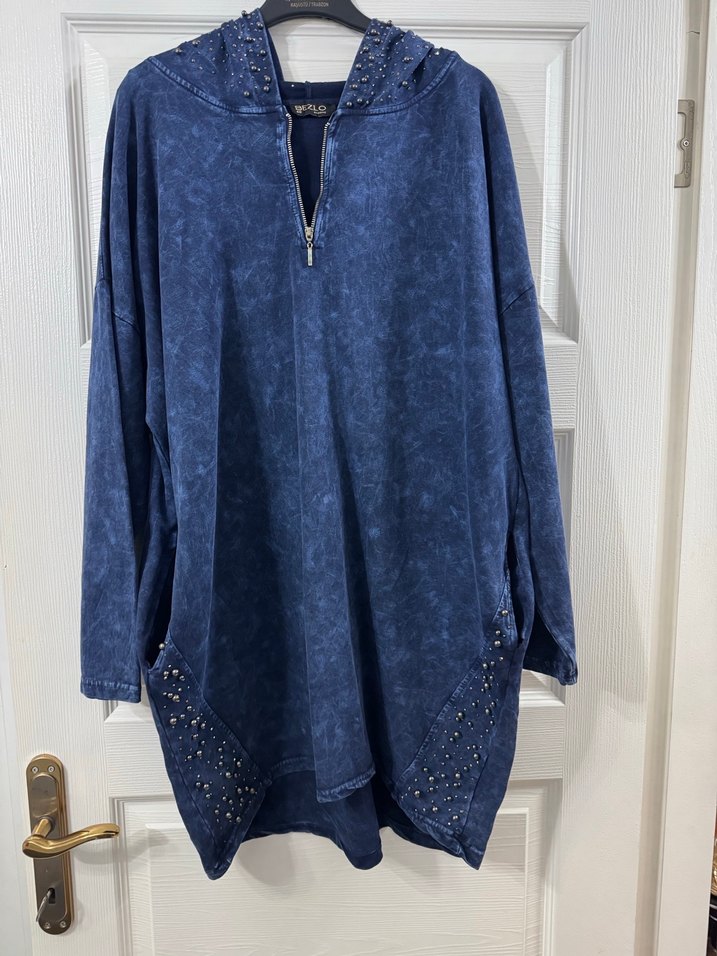 Parlak mavi batik desenli uzun denim tunik, bol kesim, uzun kollu ve kapüşonlu. Ön fermuar ve ceplerde süslemeler bulunur. Günlük rahat stil için uygun.