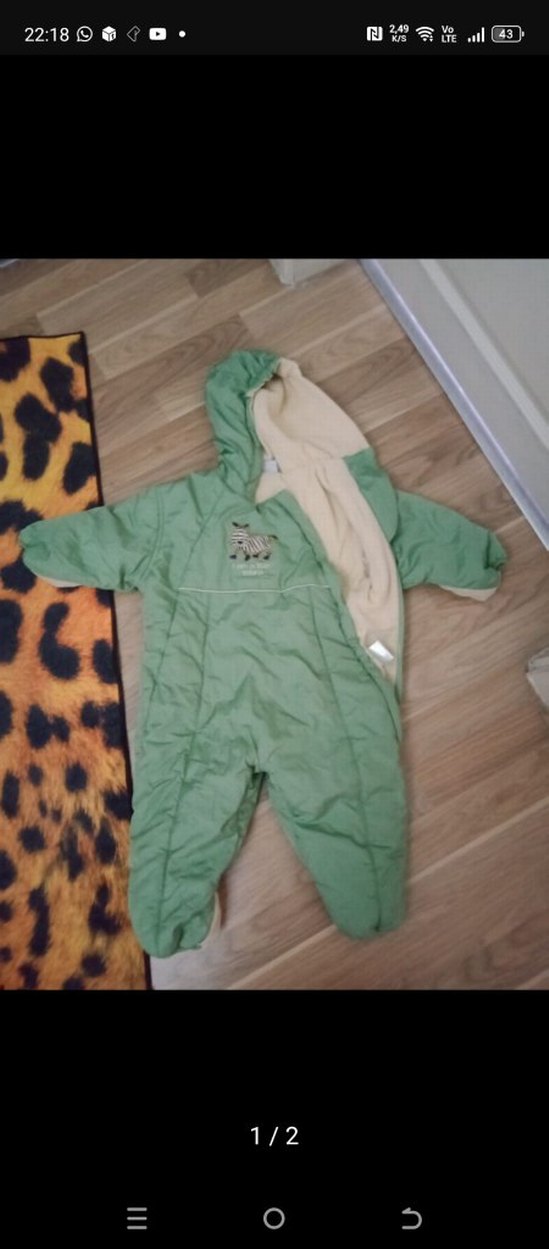 Kapüşonlu, fermuarlı ve baskılı desenli açık yeşil bebek tulumu, iç kısmı yumuşak ve sıcak tutar. ❄️
