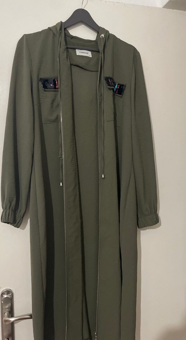 Haki yeşili uzun kapüşonlu kadın giyçık, notlu yaka ve fermuarlı ön kısmı ile dikkat çeker. Uzun kollu ve standart kesimdir, sentetik kumaş kullanılmıştır.