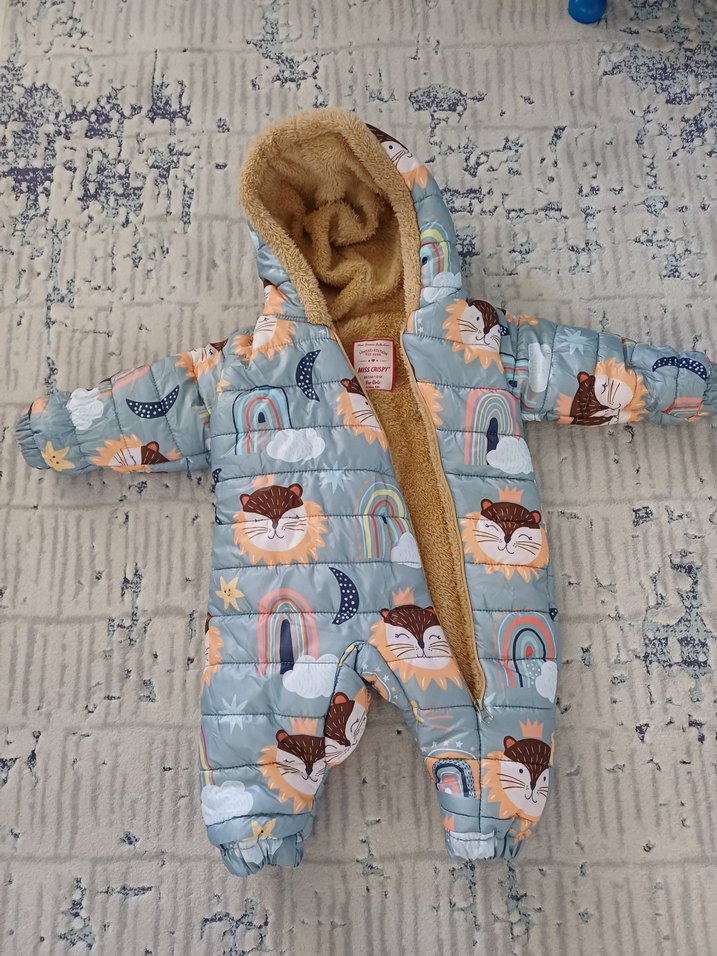 Kapüşonlu, gri baskılı bebek tulumu, içi yumuşak ve sıcak tüylü detaylı, sokak stili için uygundur. ❄️hic giyilmedi bu arada aldigimiz gibi duruyor.