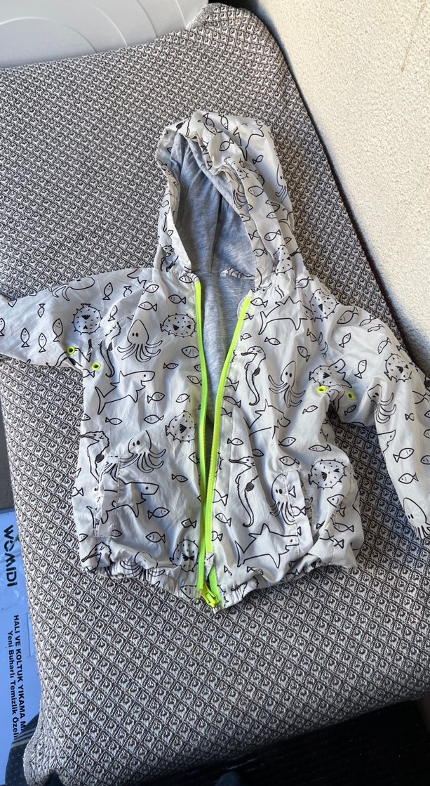 Kapüşonlu, fermuarlı ve yumuşak fleece kumaştan yapılmış gri baskılı erkek çocuk yağmurluğu. Salaş kesim ve sokak tarzı için uygun desenler içerir. 1 2 yaş